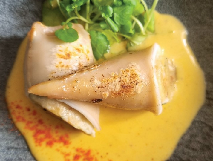 Coloque o molho de linguiça no fundo do prato e posicione a lula cortada ao meio sobre