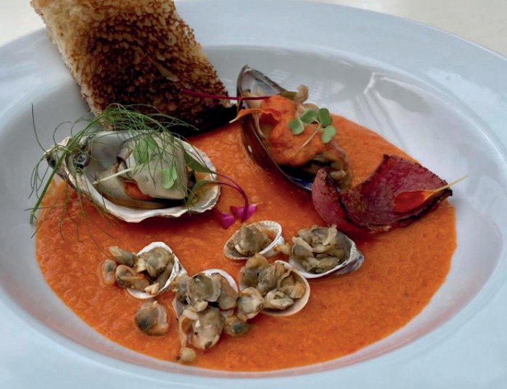Queimar os pimentões em brasa para retirar a pele, abrir no sentido comprido e retirar as sementes e partes brancas. Marinar por 30 minutos com açúcar e aceto balsâmico. Em uma panela média, refogar o alho em fogo alto, colocar os moluscos e aguardar 4 minutos para que todas as conchas estejam quentes. Acrescentar o vinho branco, baixar o fogo, tampar a panela e aguardar 5 minutos para que as conchas se abram. Reservar o líquido. Refogar a cebola com o azeite, o salame serrano e o tomate. Acrescentar os pimentões e caldo dos moluscos. Cozinhar por 10 minutos. Bater em um processador e peneirar.